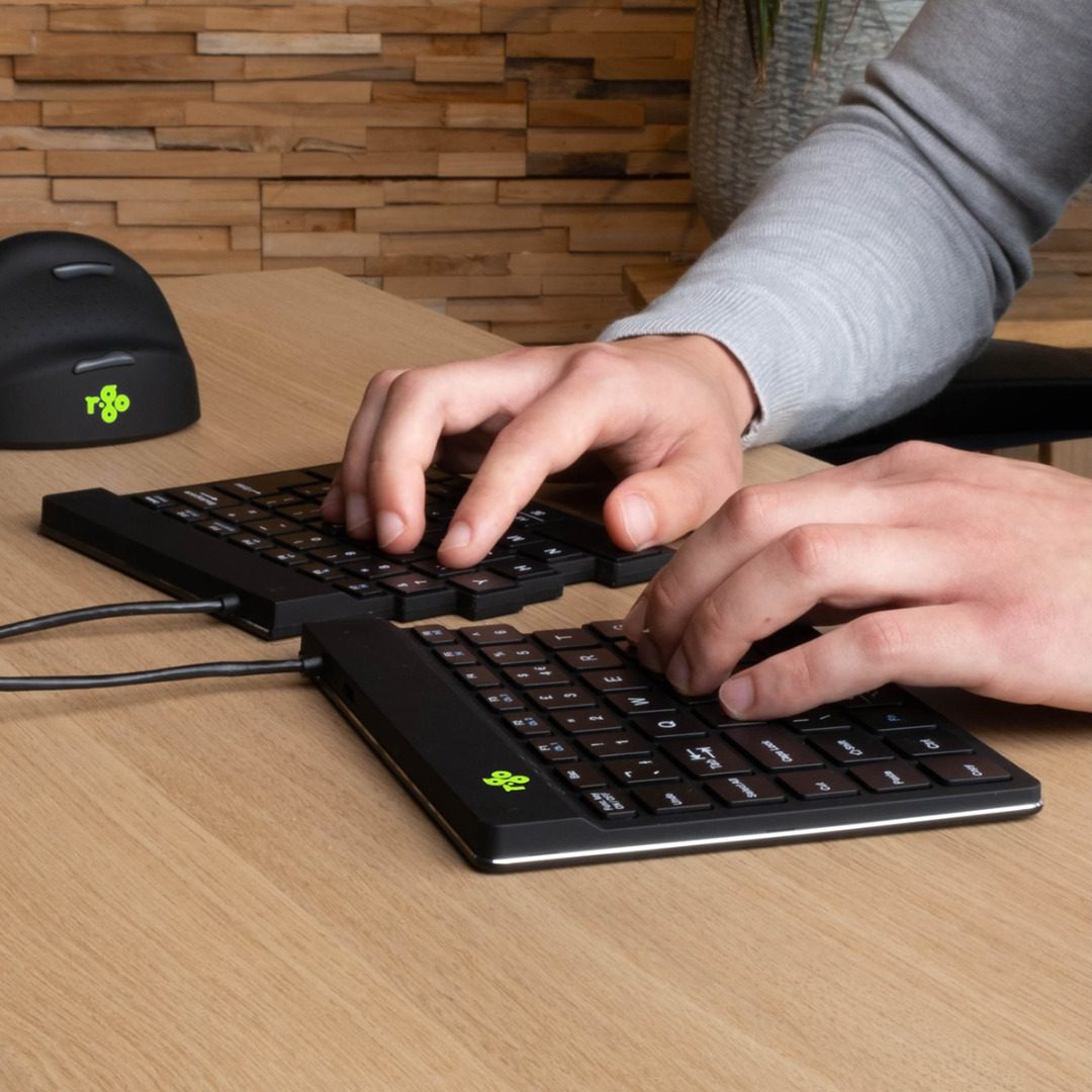 The R-Go Split keyboard consists of 2 separate parts that you can use in any desired position. So you can always type with straight wrists and prevent oppressing tendons and blood vessels. This ergonomic split keyboard can be turned into a compact keyboard with 1 move using the built-in magnet.