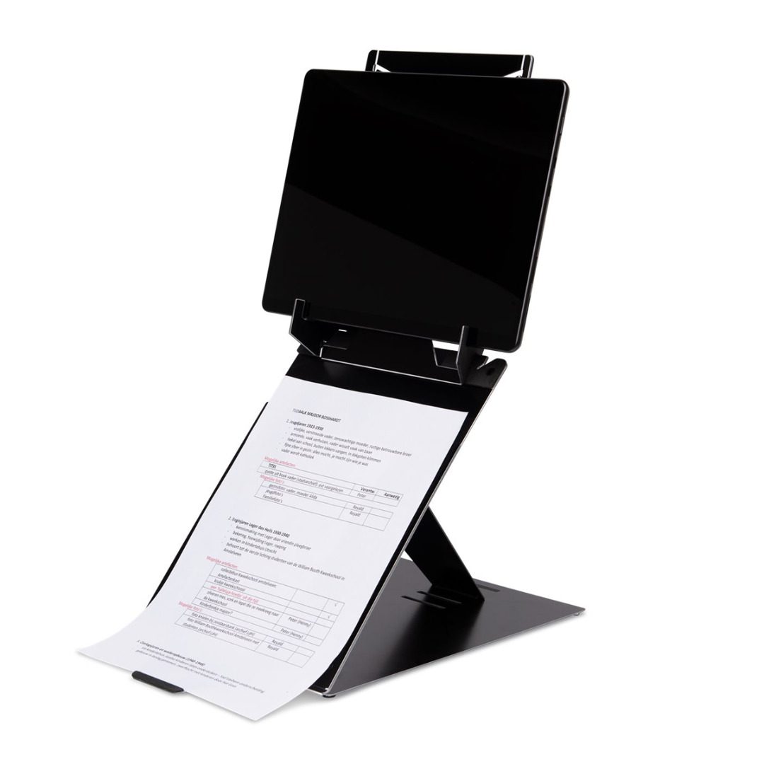 The R-Go Riser Duo laptop and tablet stand can be used to raise both your laptop and tablet. The stand is easily adjustable in height in 4 positions, so you can always work at eye level. This brings your head in a natural position and reduces tension in your neck and shoulder muscles.